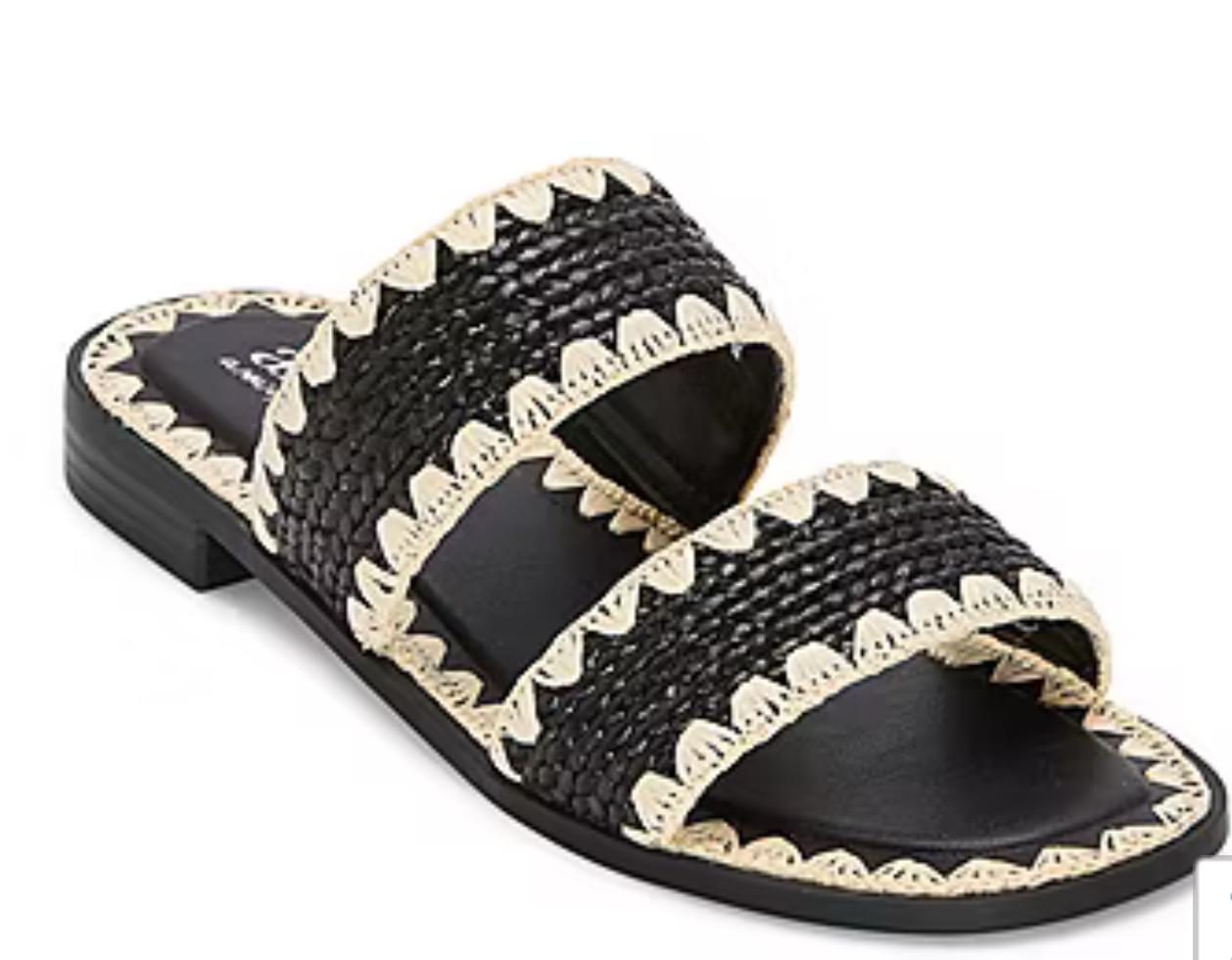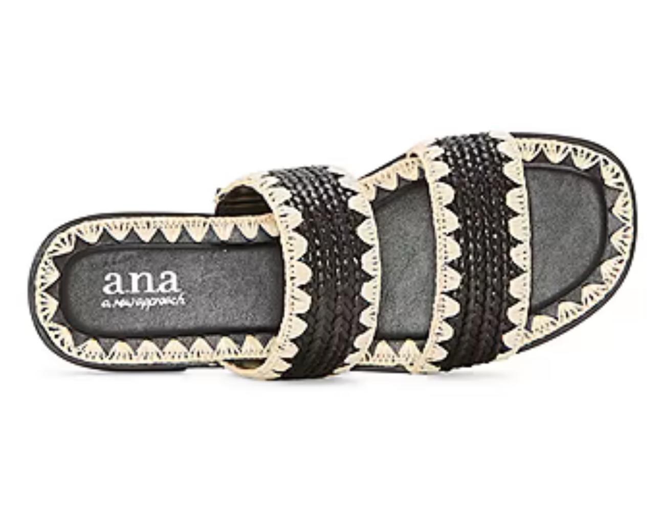 Featuring woven-look straps with contrast trim, these a.n.a women’s Danish flat sandals are a chic choice for everyday wear during the warmer months. The slip-on style features an open square toe and a low-profile sole. Match them with wide-leg linen trousers and a crop top.