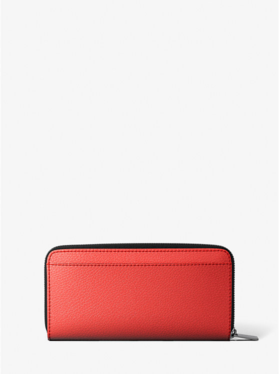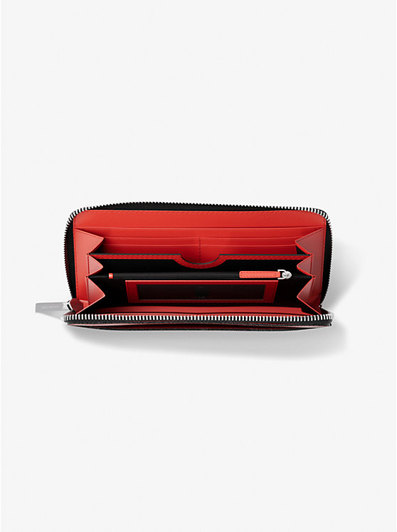 • Interior details: slip pocket, ID window, center zip compartment, card slots