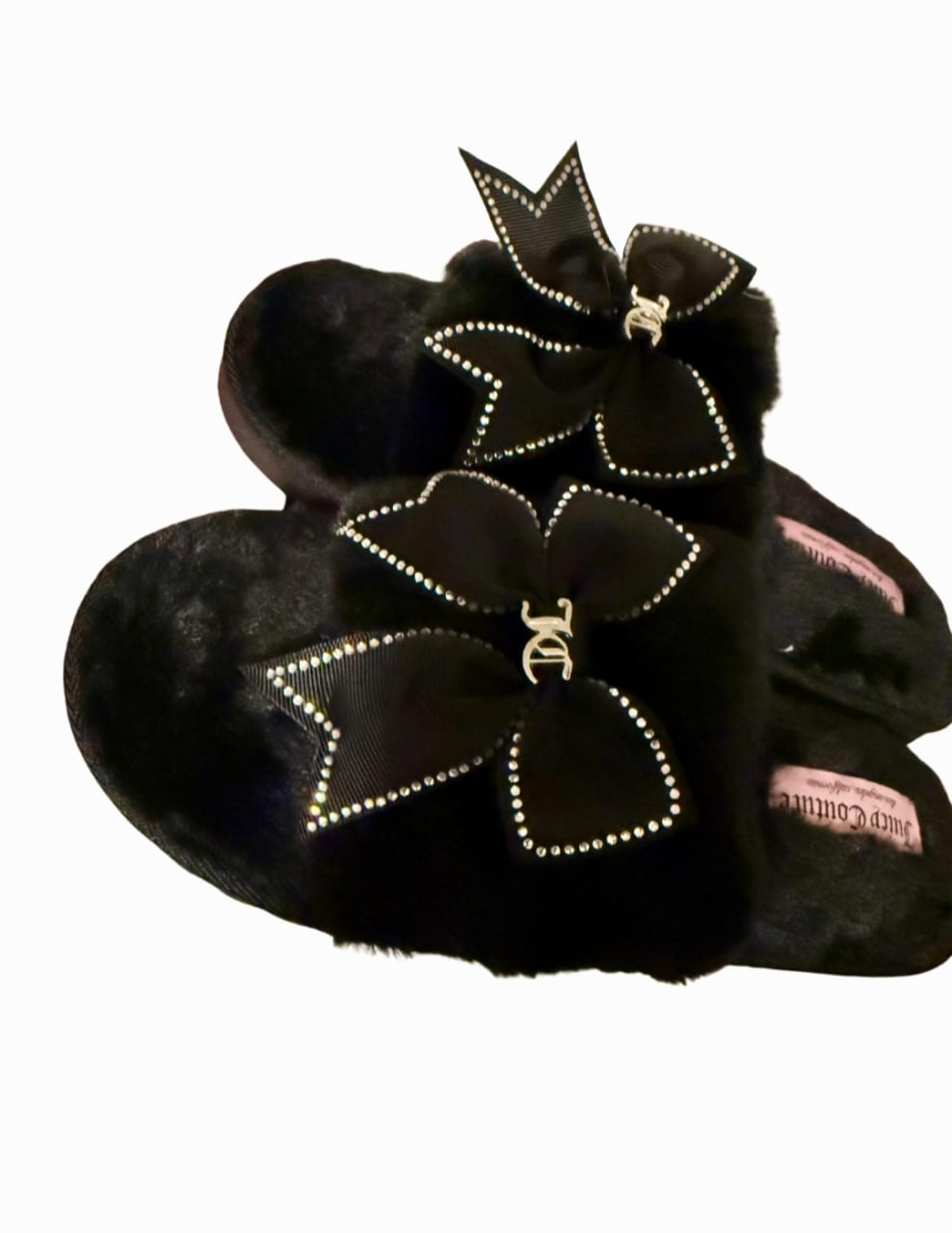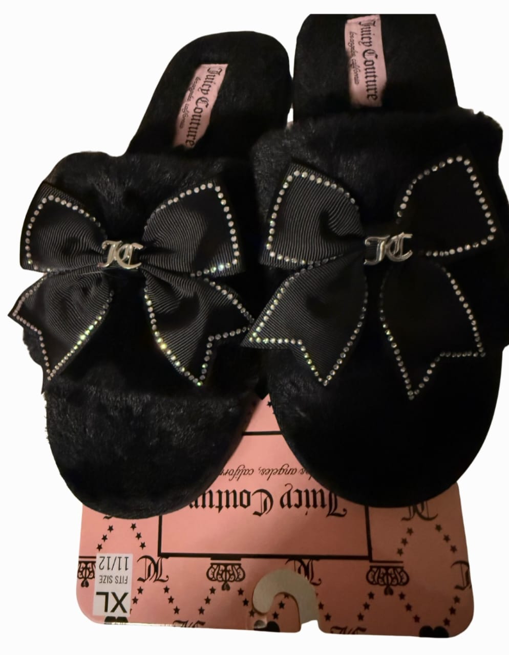 Juicy Couture brand Honora black slippers with bows rhinestones JC charms in silver tone plush comfy cozy soft. Juicy Luxe!!!