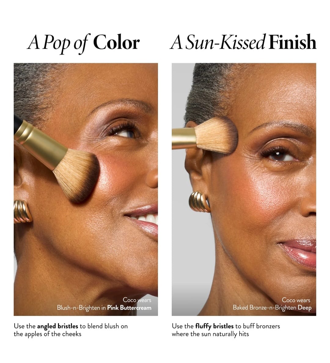 Includes angled bristles for blush and fluffy bristles for bronzer