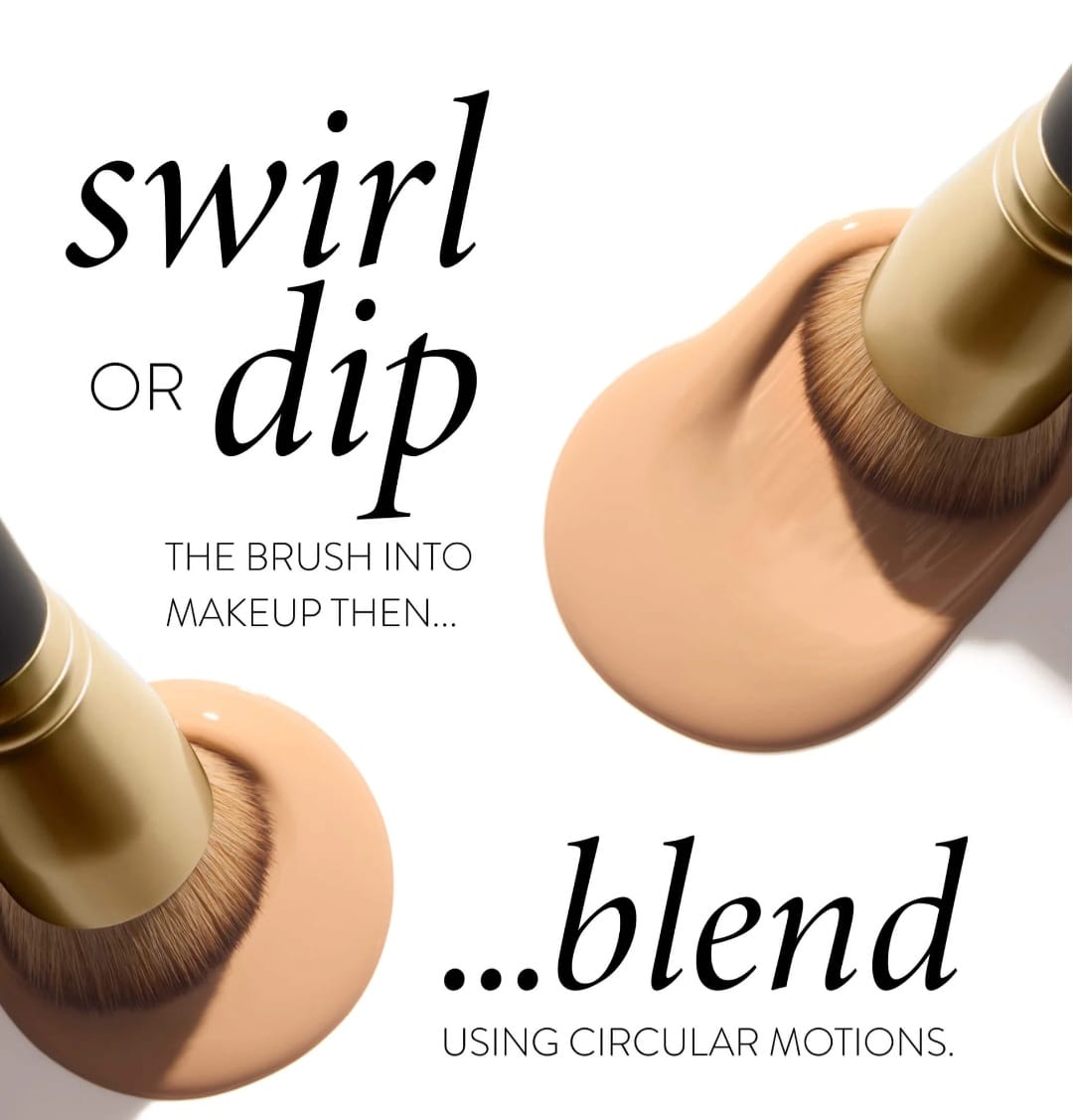 Starting at the center of the face and working outwards, buff foundations in light circular motions, adding more product and building as needed.