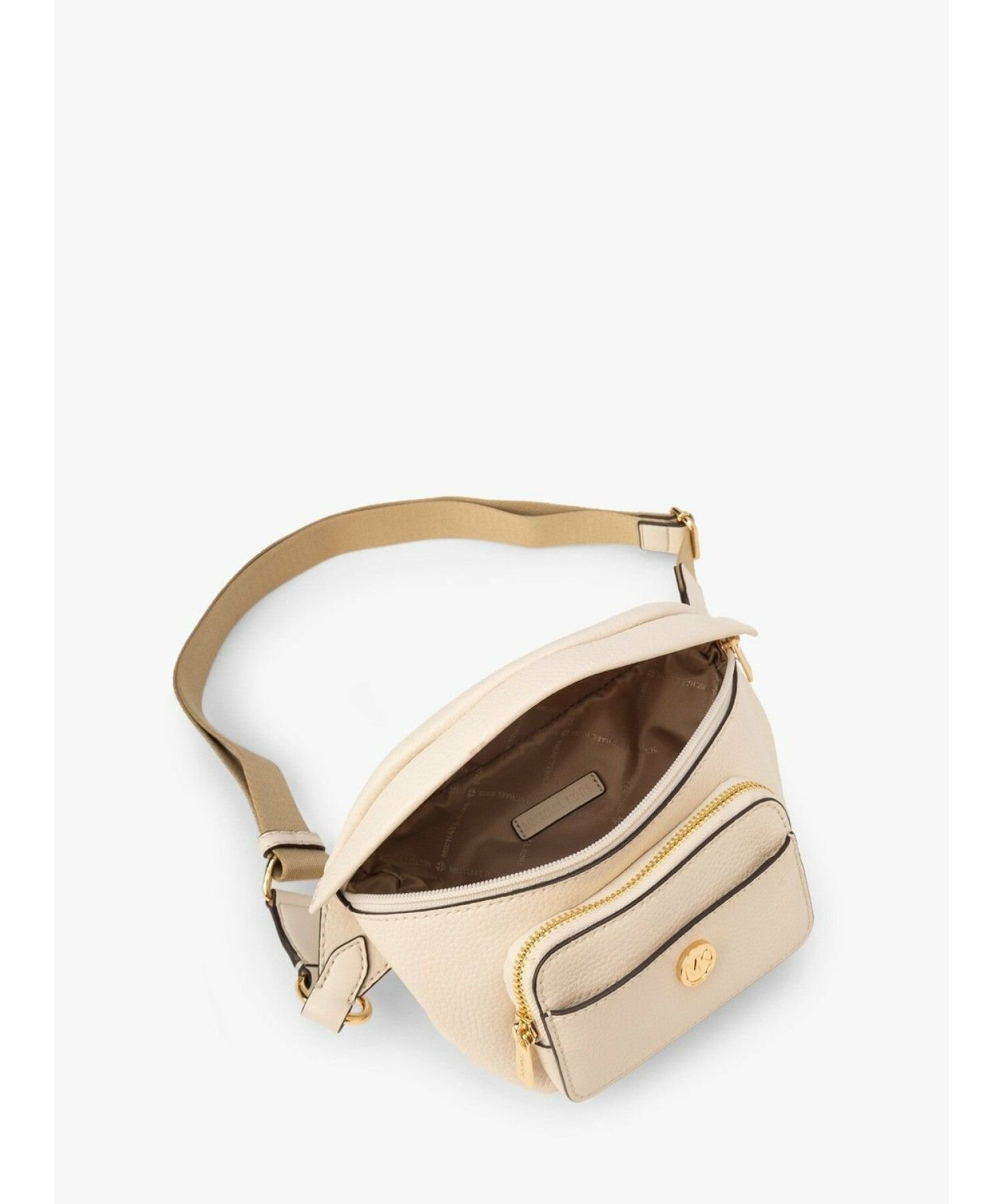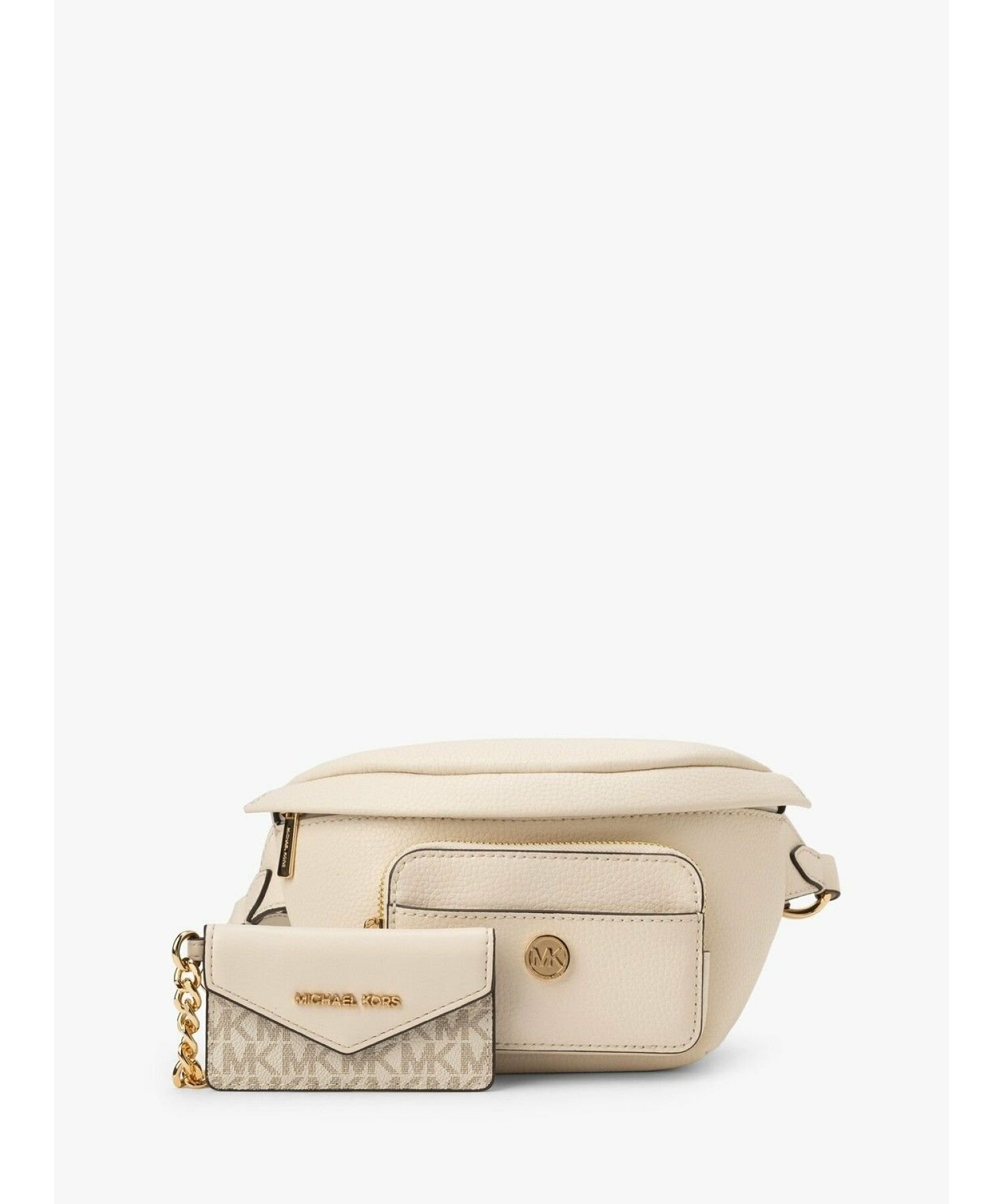 Our Maisie waist pack is a street-chic essential for off-duty days. Crafted from sleek pebbled leather, this clever 2-in-1 style includes a hidden Signature print card case that slides neatly into the front pocket to look like an integrated part of the design. Attached by a chain strap, it can be removed and carried solo when you’d rather travel light.
