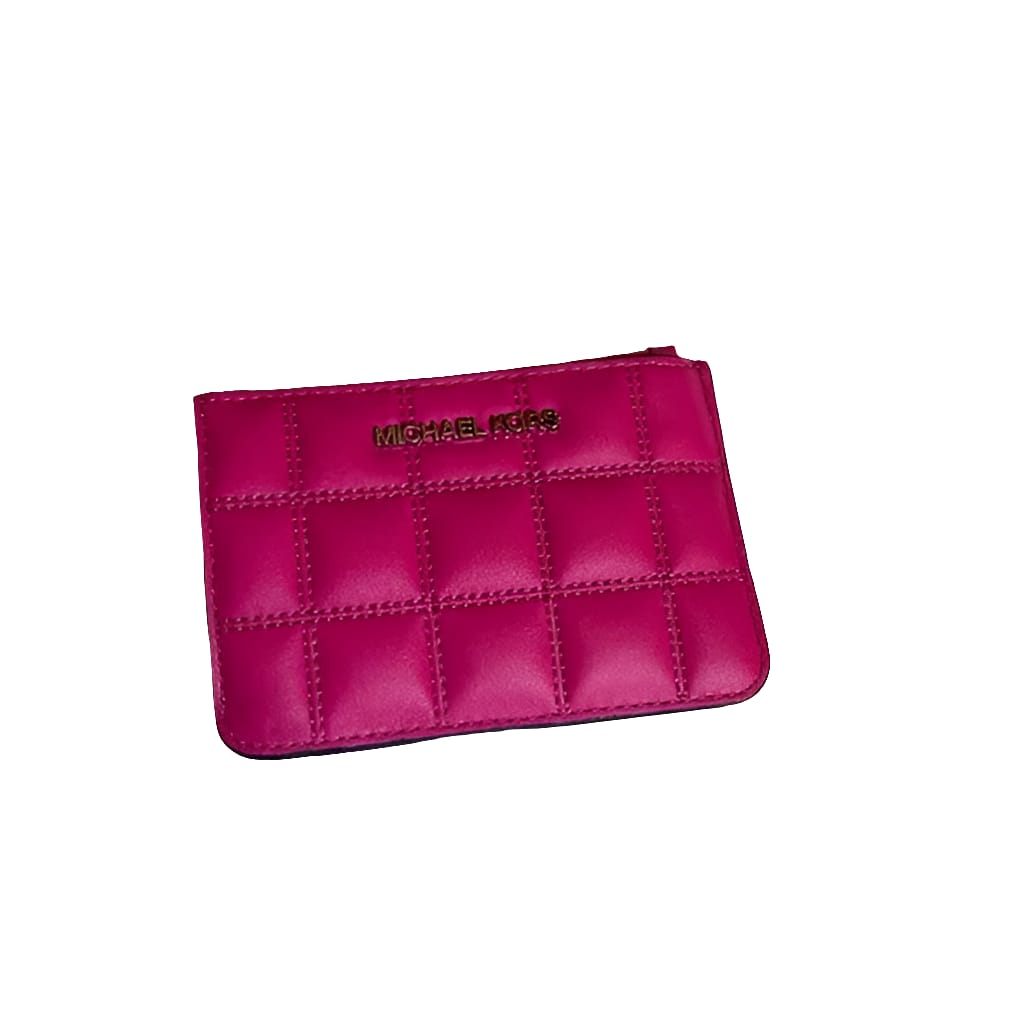 Michael Kors Women’s Jet Set Travel Small Top Zip Coin Pouch in Vegan Leather Michael Kors Jet Set Travel Coin Pouch with ID. It is beautiful. It is made of leather and has quilted squares. It has a top zipper and an outside ID slot. There are two card slots and a slip pocket on the outside. There is an attached key ring. There is also a slip pocket on the inside.This measures about 5″ X 3.5″ .