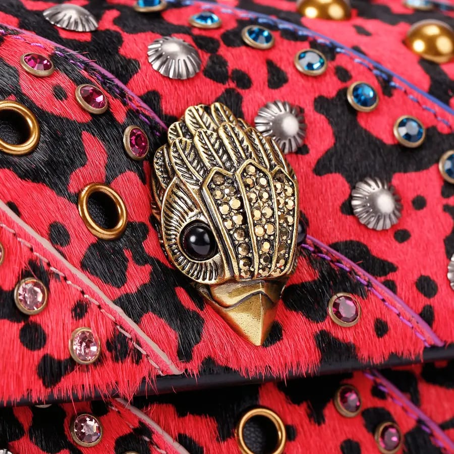 The Mini Leather Kensington bag is crafted from a pink animal printed calfhair leather which is embellished with crystals and antiqued metal studs. gold crystal eagle head sits on the front flap.