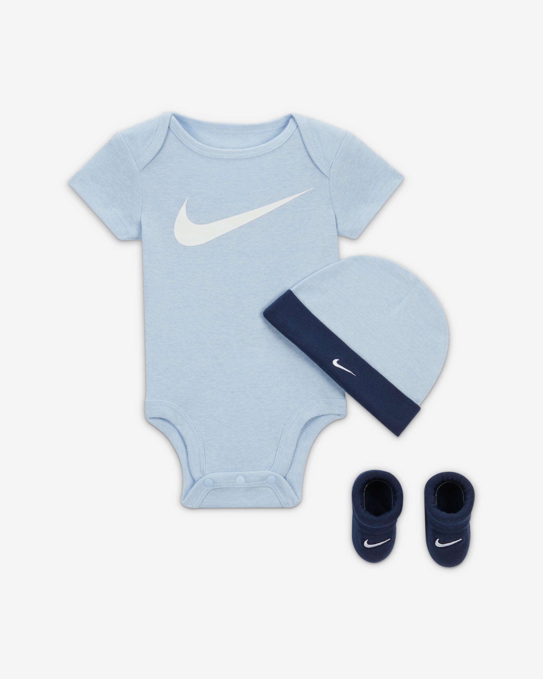 This 5-piece gift set includes coordinated essentials made of soft knit fabric that feels gentle on baby’s sensitive skin. The bodysuits have lapped shoulders and snappy tape closures on the crotch for easy changing and dressing. The bib has hook-and-loop closures to provide a comfy fit, and the matching beanie and booties feature logo embroidery.