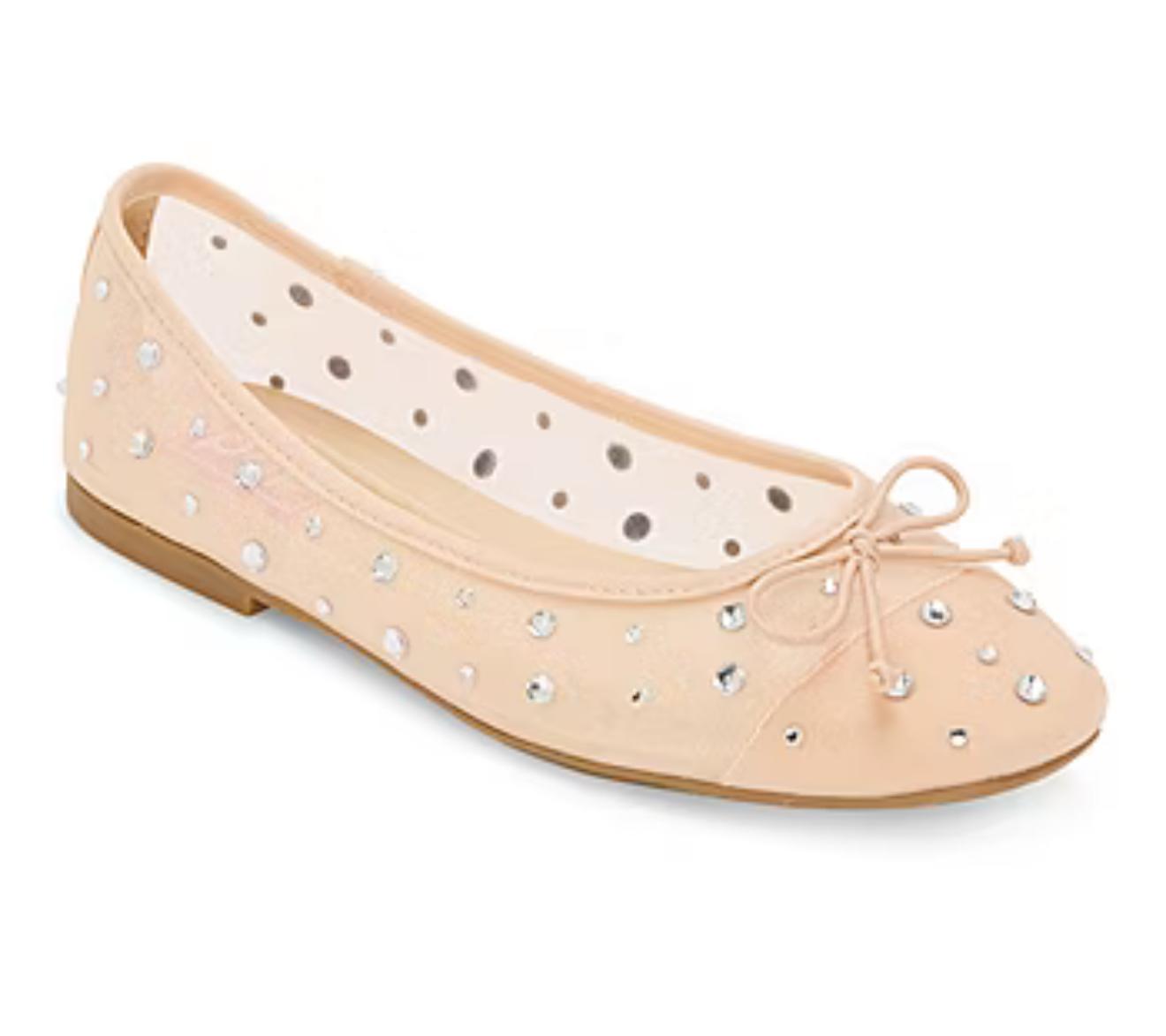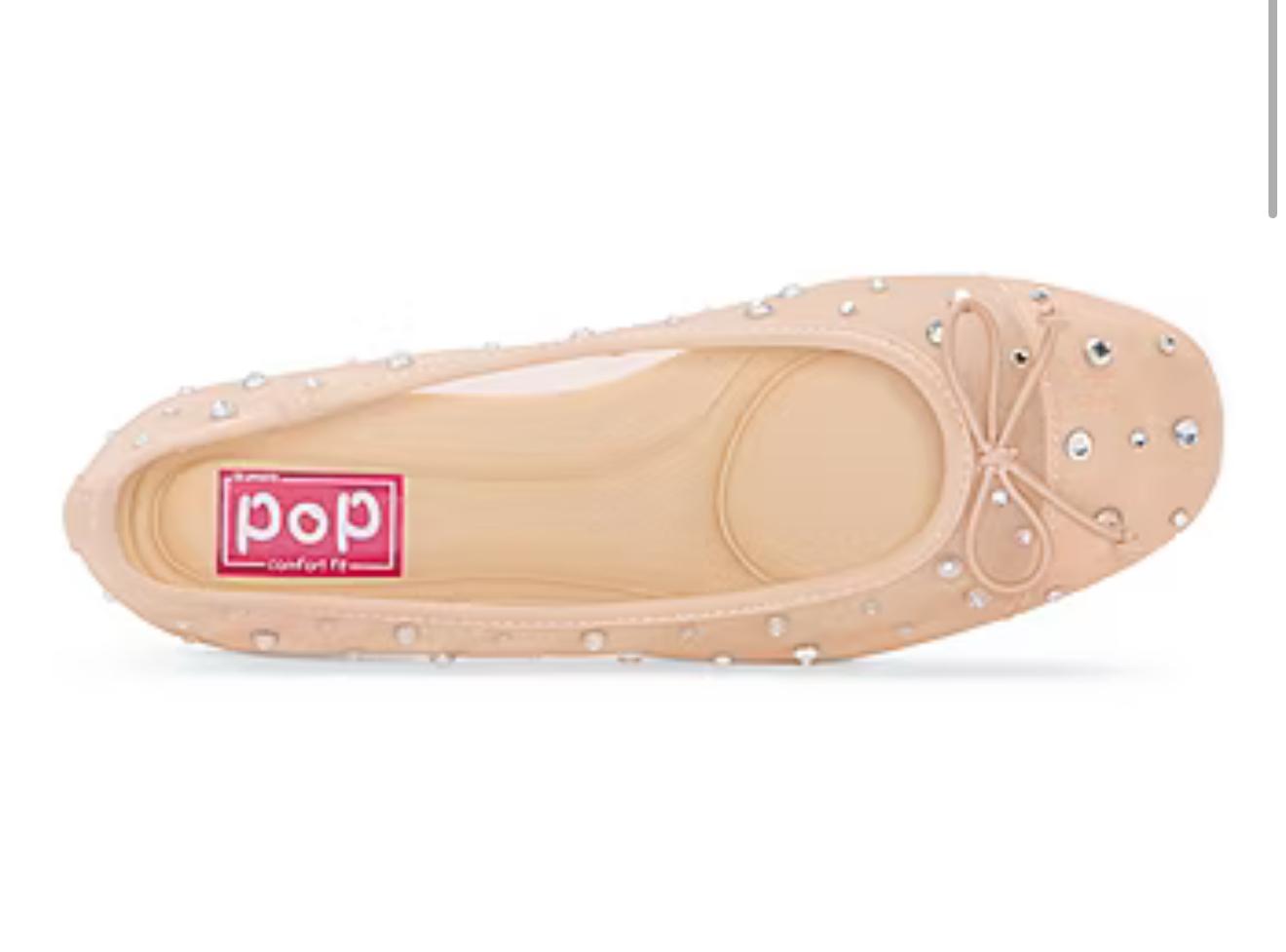 These Pop women’s Attraction ballet flats are a stylish on-trend pair to wear to add glamor to skinny jeans and a top or your favorite dress. Made from mesh in an open-knit design embellished with rhinestones, this slip-on style has a memory foam cushioned insole for your comfort and a bow.