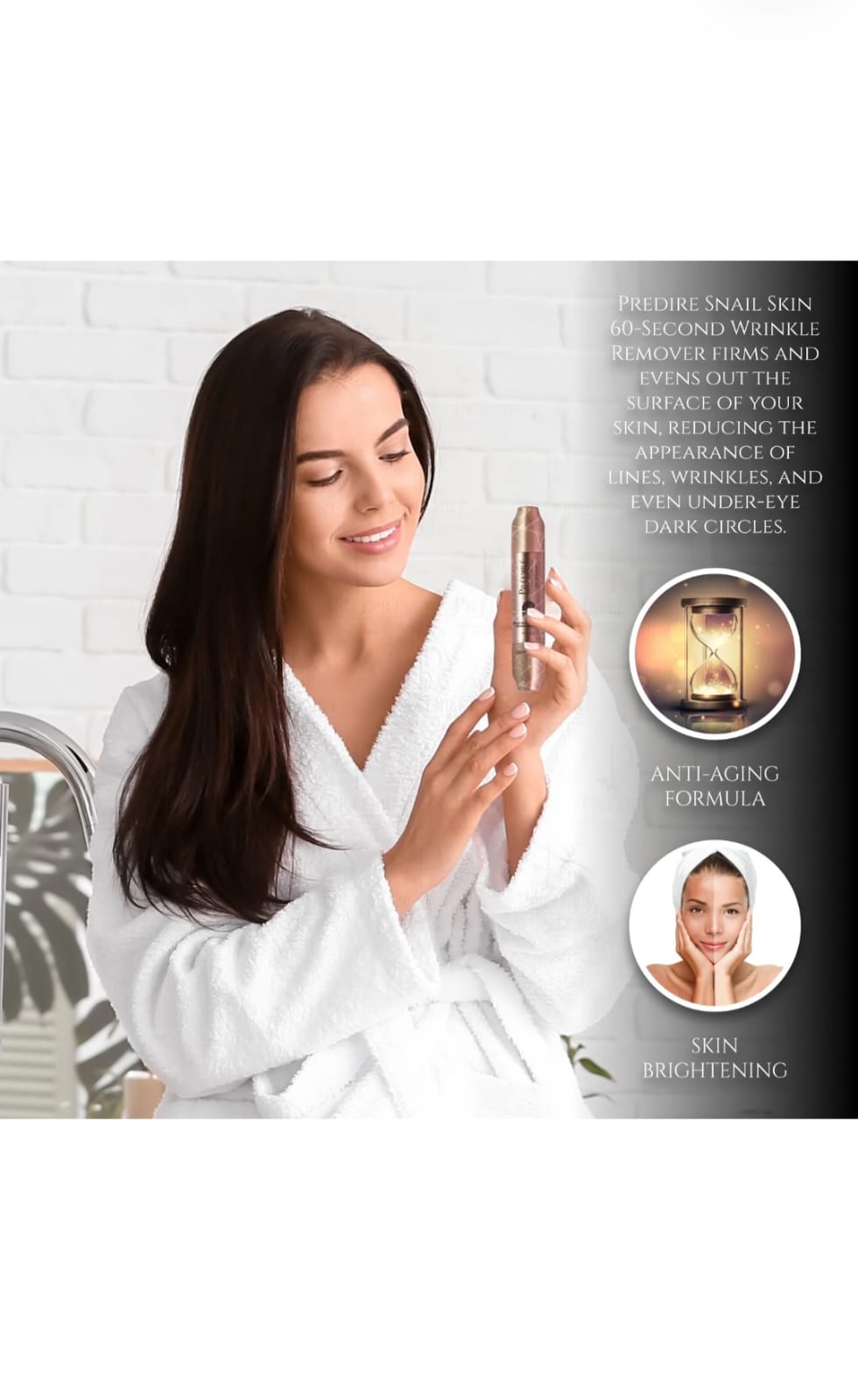 Predire Snail Skin 60-Second Wrinkle Remover firms and evens out the surface of your skin, reducing the appearance of lines, wrinkles, and even under-eye dark circles and puffiness rapidly within 60 seconds. Once applied, it lasts for hours, skin stays smooth and flexible, make you more confident and beautiful