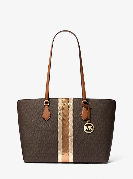 The Sheila tote is an elegant take on a timeless silhouette. Finished in our Signature logo print with a metallic snake-embossed stripe, it features a spacious interior with a center zip pocket for easy organizing. Slip it over your shoulder seven days a week.