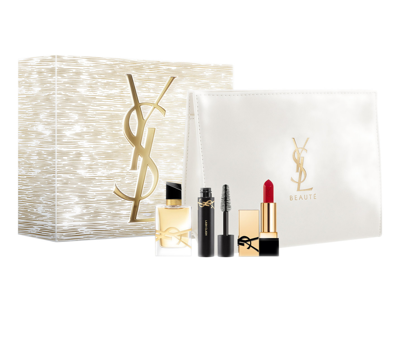 YSL Libre Eau De Parfum with Orange Blossom and Lavender 7.5ml; YSL Rouge Pur Couture Caring Satin Lipstick: Shade RM Rouge Muse 1.3g; YSL Lash clash Extreme Volume Mascara in iconic black shade 2ml; Holiday Pouch