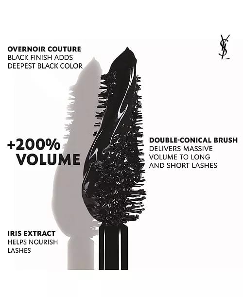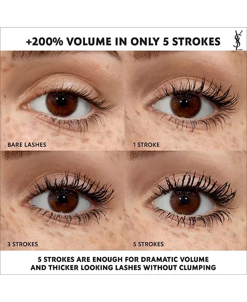 YSL Lash Clash extreme volume mascara: this volumizing mascara adds pigmented color, 200 percent more volume with up to 24-hour smudge-proof wear. The massive brush and formula coat each lash to deliver varying levels of volume from one to five strokes